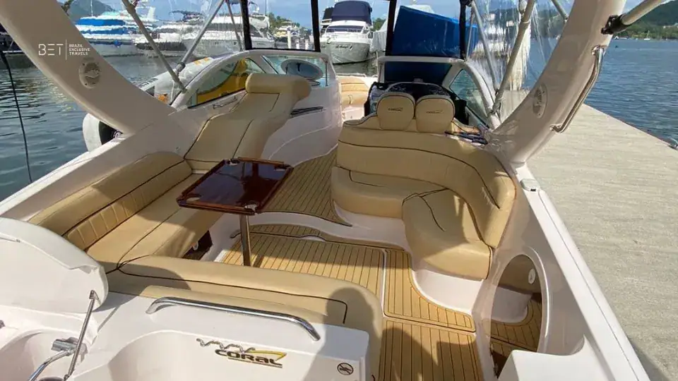Sa taille raisonnable facilite la navigation et permet un accès rapide aux plages, aux baies ou aux coins plus isolés. Que vous envisagiez une courte excursion d’île en île, une croisière panoramique, une baignade ou une balade au coucher du soleil, le Cobra 28 s’adapte à toutes vos envies. L’embarquement se fait généralement depuis une marina desservant la région d’Angra dos Reis.