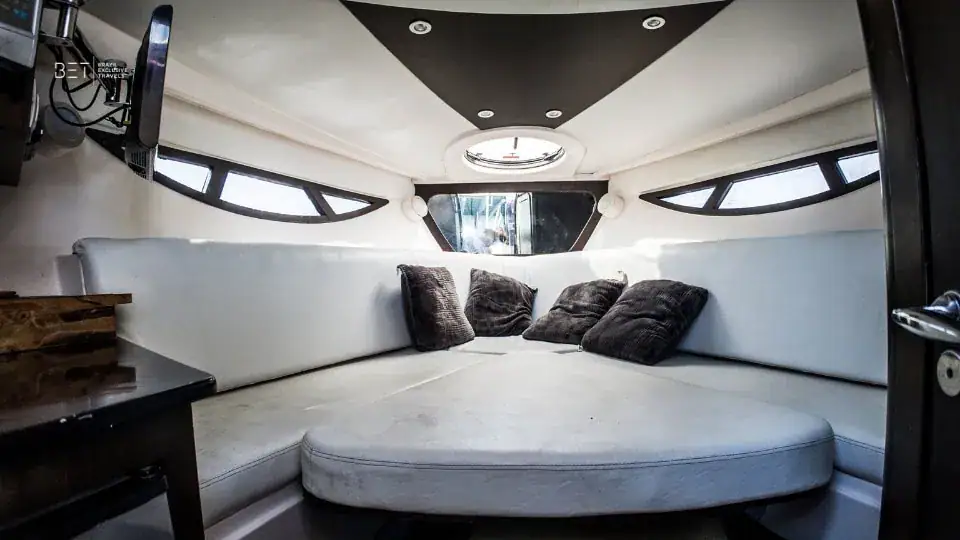 Le FS310 Black Pearl est un élégant hors-bord de 9,5 mètres (31 pieds) conçu pour des journées de détente et de plaisir sur l’eau. Son aménagement comprend une cabine intérieure, un confortable espace salon extérieur et un bain de soleil à l’avant qui invite à la relaxation et à la contemplation du paysage. Le bateau peut accueillir jusqu’à 10 personnes, ce qui le rend idéal pour les familles, les groupes d’amis ou les couples en quête d’une expérience intime et confortable.