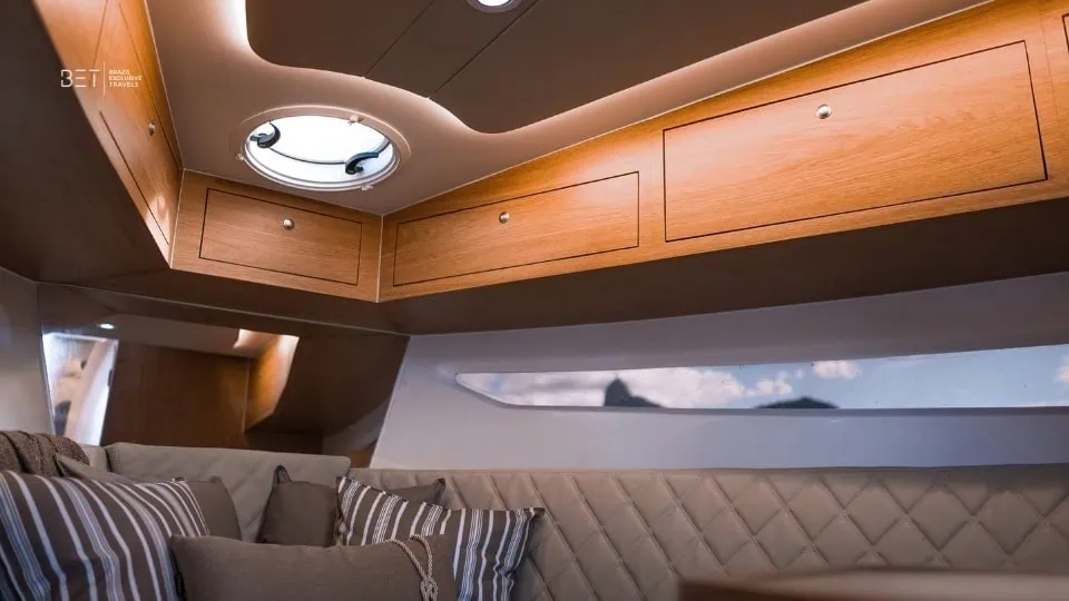 Le Zath 328HT offre un agencement convivial et ouvert, invitant à la détente dès qu’on y met les pieds. Grâce à son pont bien agencé et son hard-top abrité, il accueille confortablement des petits groupes de 6 à 8 personnes souhaitant passer une journée en mer sans se sentir à l’étroit. La navigation est douce et stable, même sur les longues distances entre les plages, et le cockpit abrité rend l’expérience agréable par beau temps comme par vent léger. Ce qui le distingue vraiment, c’est sa grande polyvalence : les familles le choisissent souvent pour des après-midis de détente, tandis que les couples apprécient les croisières intimes et les sorties au coucher du soleil. Il convient également parfaitement aux groupes d’amis recherchant une ambiance conviviale et chaleureuse. Les départs se font généralement de Marina da Glória, plaçant les passagers à l’entrée même de la baie de Guanabara.