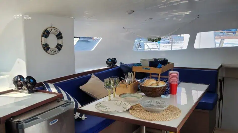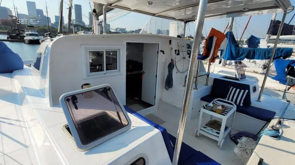 Le catamaran 37′ est un choix élégant pour ceux qui recherchent flexibilité, confort et charme à bord. Ses cabines, son pont ouvert, ses filets à l’avant et ses espaces de vie offrent une ambiance chaleureuse et conviviale. Que vous soyez entre amis, en famille ou en groupe mixte, vous profiterez d’une navigation paisible, d’un mouillage aisé et d’une atmosphère détendue, idéale pour créer des souvenirs inoubliables le long de la côte de Rio.