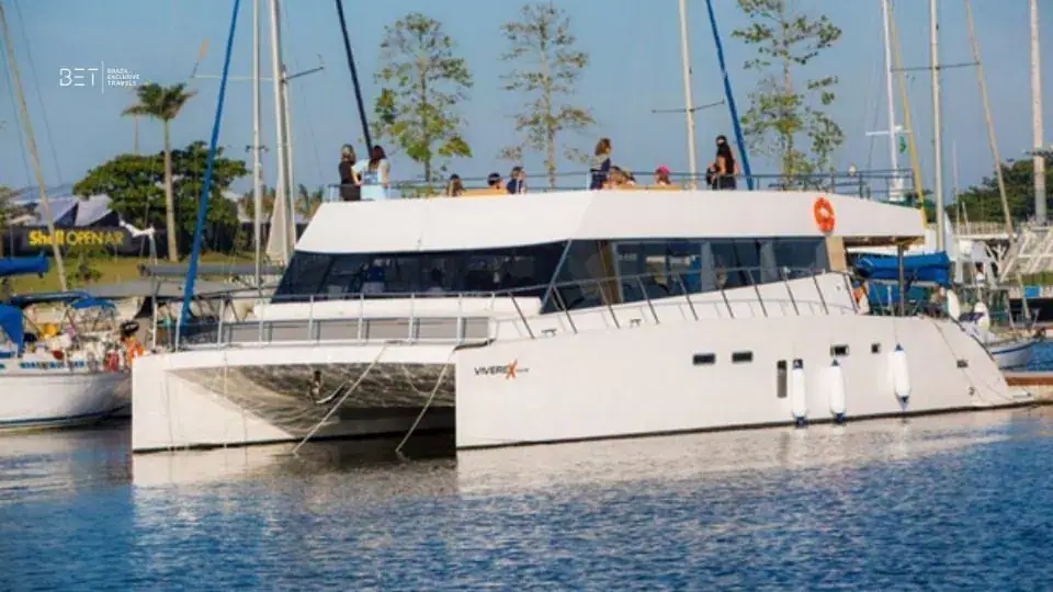 La navigation est douce et stable, même par mer légèrement agitée, rendant la croisière agréable, que ce soit le long des côtes ou au mouillage près d’une plage. Ce qui distingue ce bateau, c’est sa capacité à s’adapter à une multitude d’occasions, des fêtes animées et événements d’entreprise aux croisières paisibles en famille ou en couple, en passant par les couchers de soleil romantiques. L’embarquement se fait généralement depuis une marina du centre de Rio, offrant un accès facile aux baies et aux panoramas côtiers dès le départ.