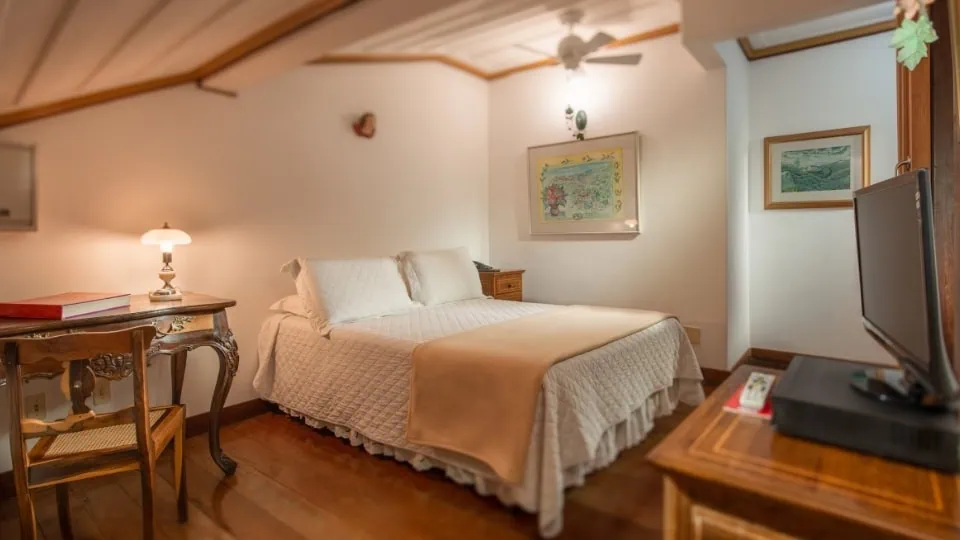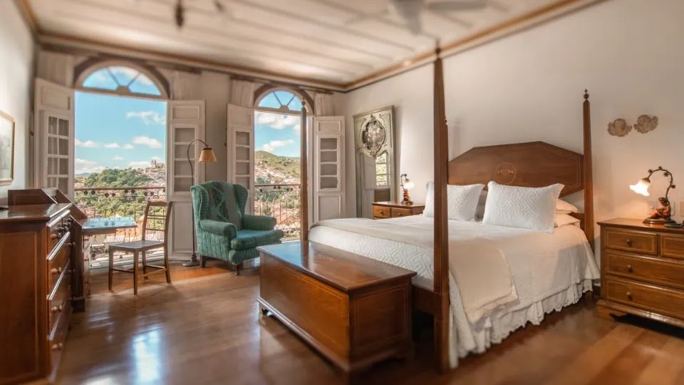 A Pousada do Mondego oferece vista para as igrejas icônicas e os telhados de telha de Ouro Preto, instalada em um prédio do século XVIII que preserva a alma mineira. Móveis antigos, pisos de madeira e obras de arte que celebram a história do ciclo do ouro na região criam uma atmosfera intimista, atemporal e profundamente local. Seja para explorar a arquitetura colonial, visitar Inhotim em um passeio de um dia ou simplesmente contemplar a neblina sobre as montanhas ao entardecer, é aqui que Ouro Preto revela sua poesia e nostalgia.