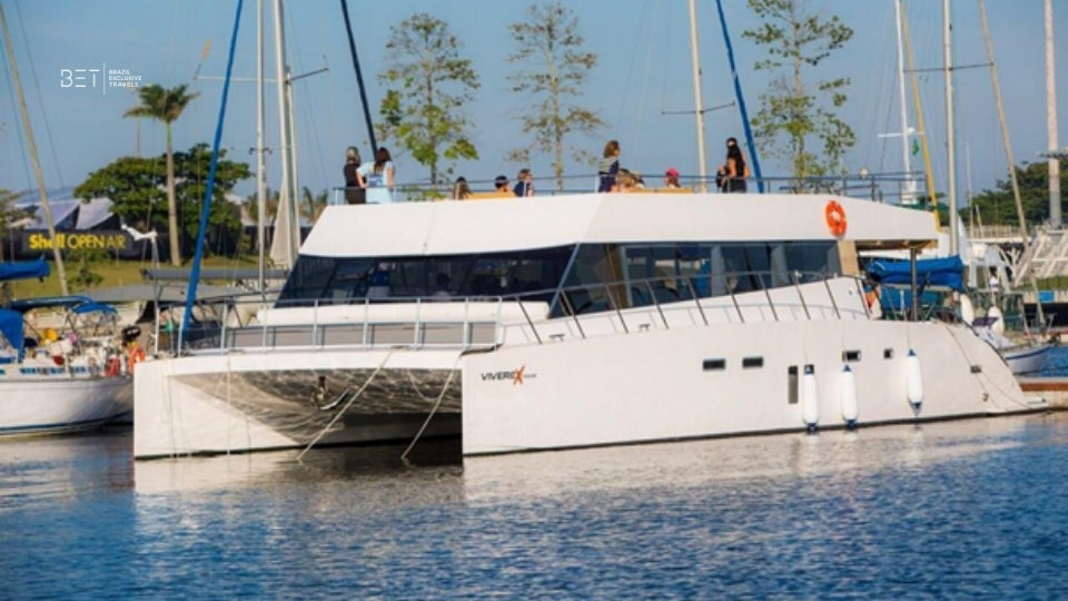 A navegação é suave e estável, mesmo com ondas leves, garantindo uma viagem agradável seja navegando pela costa ou ancorado próximo a uma praia. O que distingue esta embarcação é sua capacidade de se adaptar a diferentes tipos de passeios, desde festas animadas e eventos corporativos até cruzeiros tranquilos em família ou a dois e encontros ao pôr do sol. O embarque geralmente acontece em uma marina central no Rio, oferecendo acesso fácil a baías e vistas costeiras logo no início do passeio.