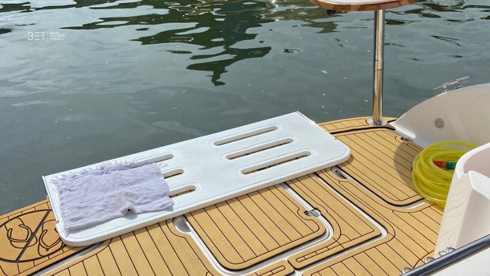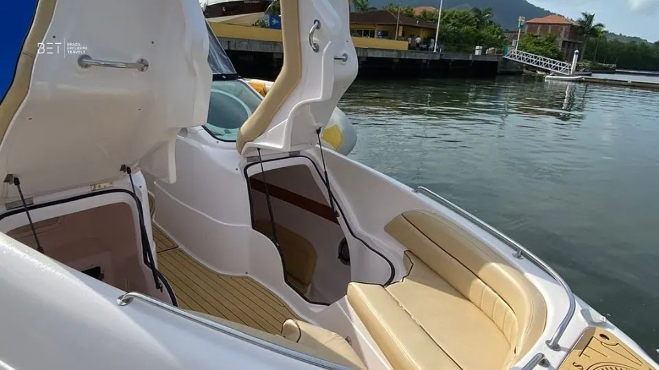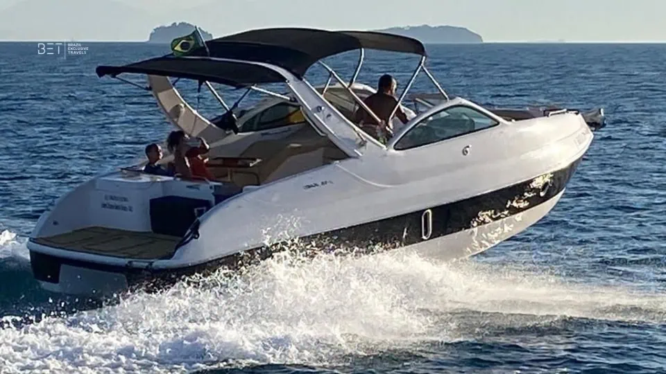 Its manageable size makes navigation easy and flexible, allowing quick access to beaches, bays or secluded spots. Whether the plan is a short island hop, a scenic cruise, a swim break or a sunset ride, the Cobra 28 adapts effortlessly. Embarkation usually occurs from a marina serving the Angra dos Reis region.